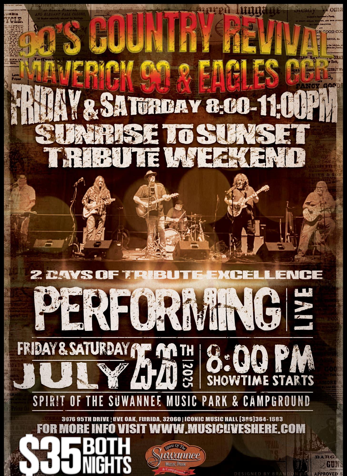 🎸 Join us July 25 & 26 for two nights of 90s country revival featuring Maverick 90 and a tribute to the Eagles & CCR, all happening at Suwannee Music Park!