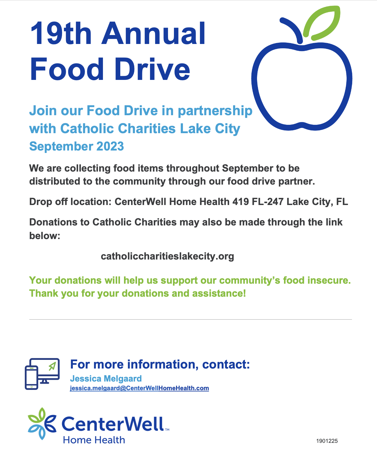 CenterWell Home Health is hosting the 19th Annual Food Drive through the month of September. Drop off location is their office at 419 FL-247 in Lake City.