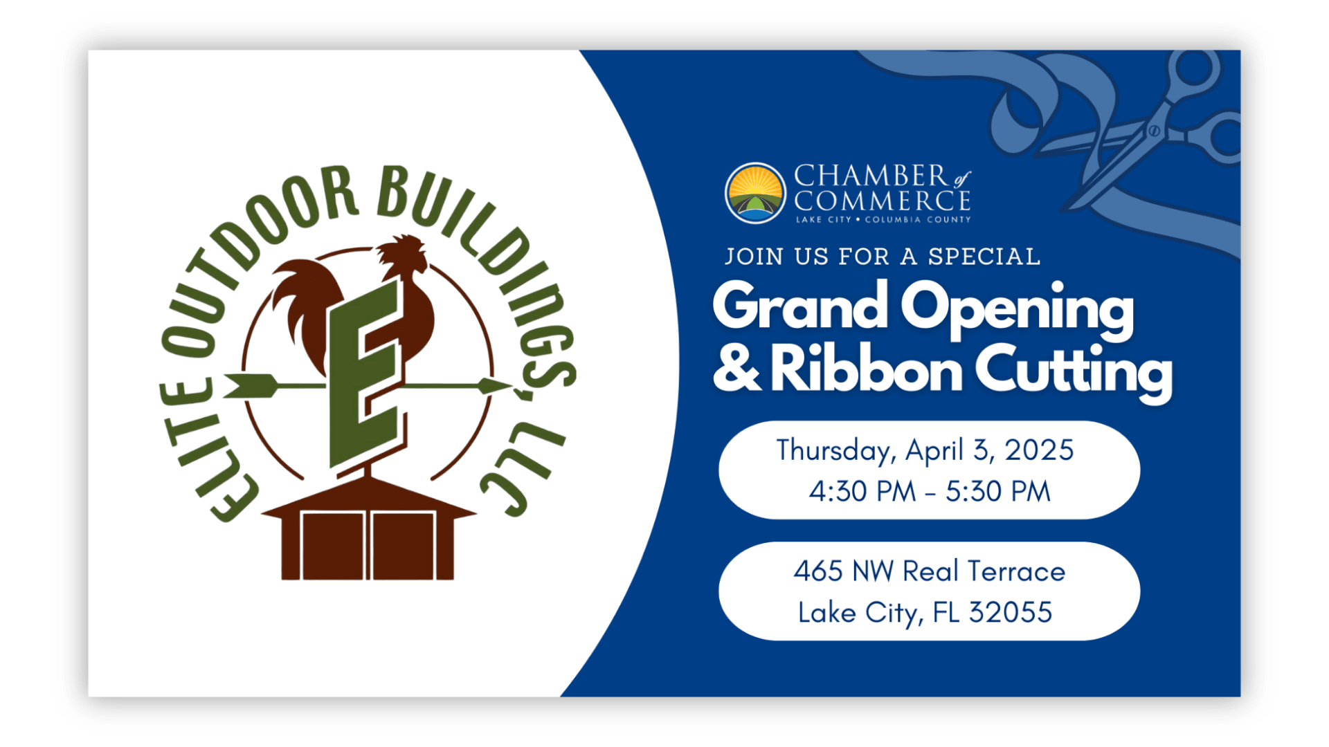 The Lake City - Columbia County Chamber of Commerce is proud to celebrate the grand opening of Elite Outdoor Buildings with a ceremonial ribbon cutting! We invite you to join the Chamber of Commerce, Board of Directors, and fellow members to explore this brand new location of Elite Outdoor Buildings having recently expanded into Lake City. Their new location is across from Lowe's, at the corner of Real Terrace and Bascom Norris Drive.