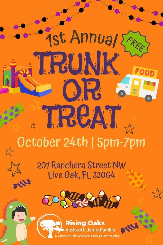 Head over to Rising Oaks ALF in Live Oak for a FREE Trunk or Treat with candy, food, and fun!