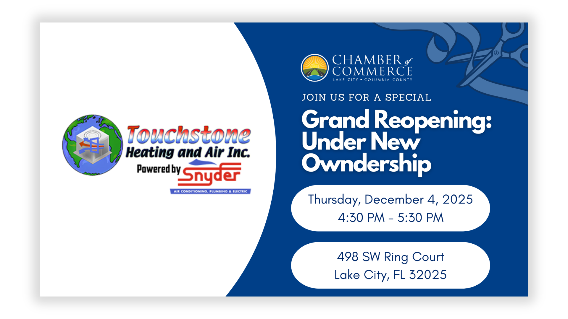 In keeping with the spirit of strengthening our hometown's economy through quality relationships, we invite you to join the Chamber of Commerce, Board of Directors, and your fellow members as we celebrate the Grand Reopening of Touchstone Heating and Air, under new ownership of Snyder Air Conditioning, Plumbing & Electric.