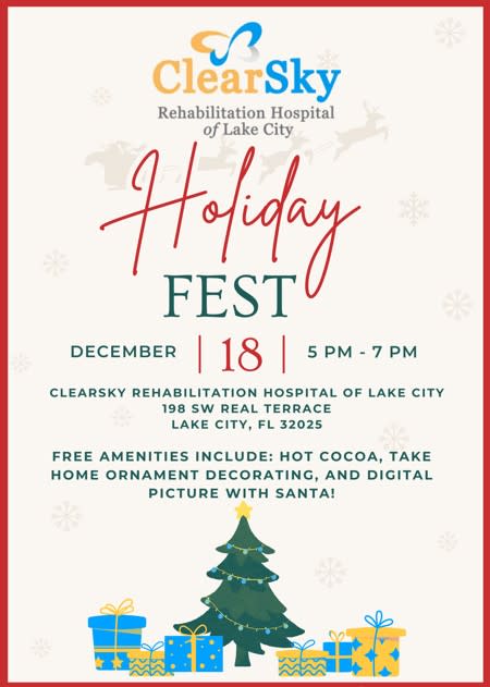 The community is invited to ClearSky Rehabilitation Hospital's Holiday Fest, with bounce houses, hot chocolate, face painting, hotdogs, and more!