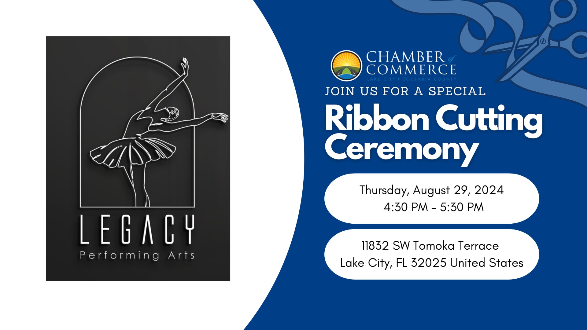 The Lake City - Columbia County Chamber of Commerce is proud to announce that Legacy Performing Arts is celebrating a grand opening in Lake City with a ceremonial ribbon cutting. They invite you, along with the Chamber Board of Directors and fellow members, to celebrate and tour their studio! We hope to see you there.