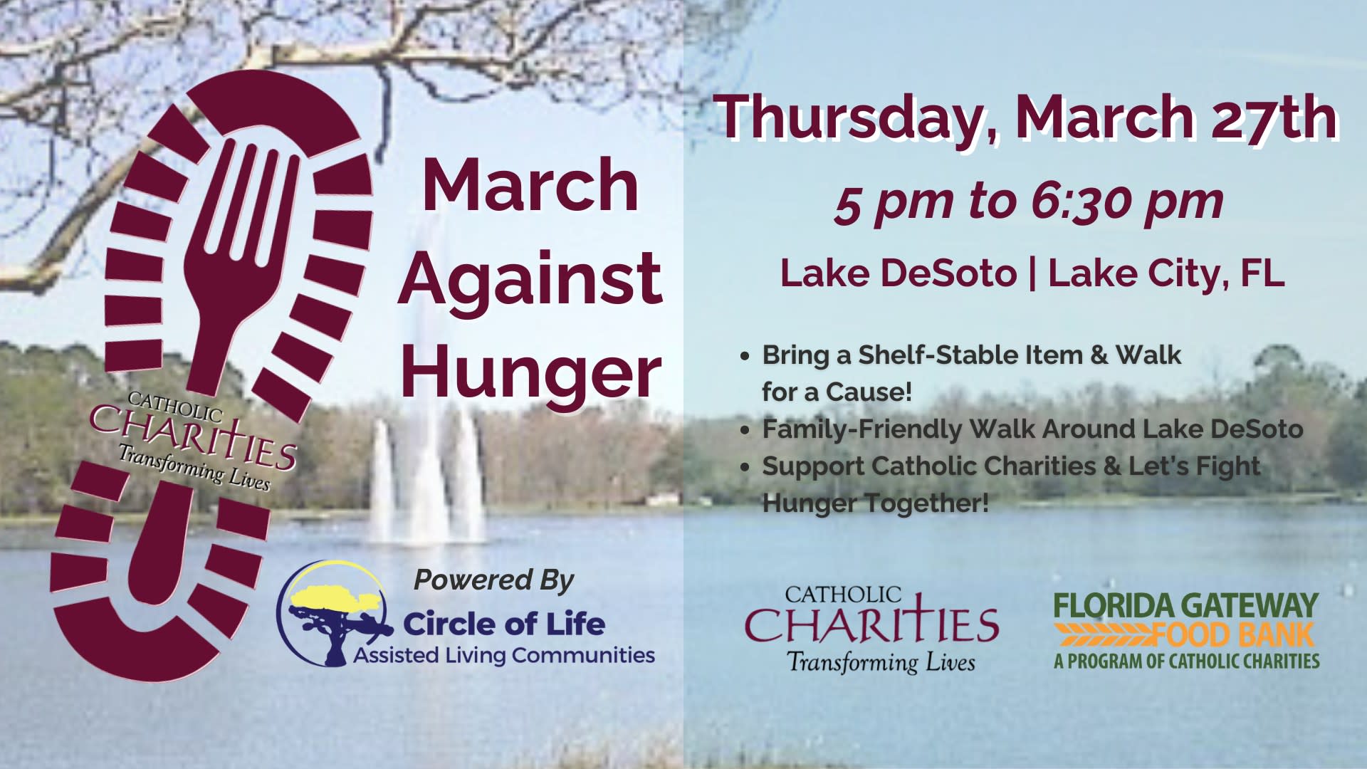 Join Catholic Charities Lake City and Circle of Life Assisted Living Facilities as we “March Against Hunger” on Tuesday, March 27, 5 pm to 6:30 pm, around Lake DeSoto in downtown Lake City!