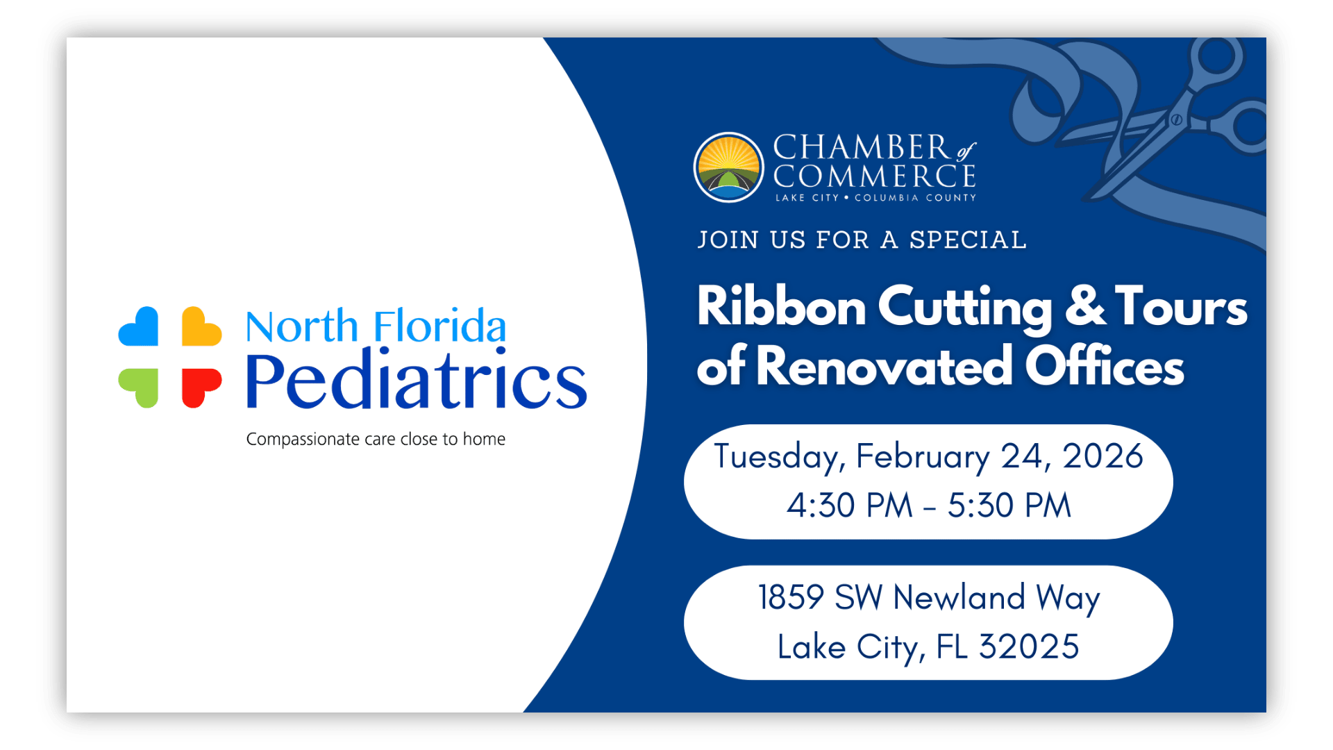 North Florida Pediatrics, along with the Chamber of Commerce, Board of Directors, and your fellow members, invite everyone to attend a very special ceremonial Ribbon Cutting celebrating their recent renovations. Please come and tour their space on Tuesday, February 24, at 4:30 pm.
