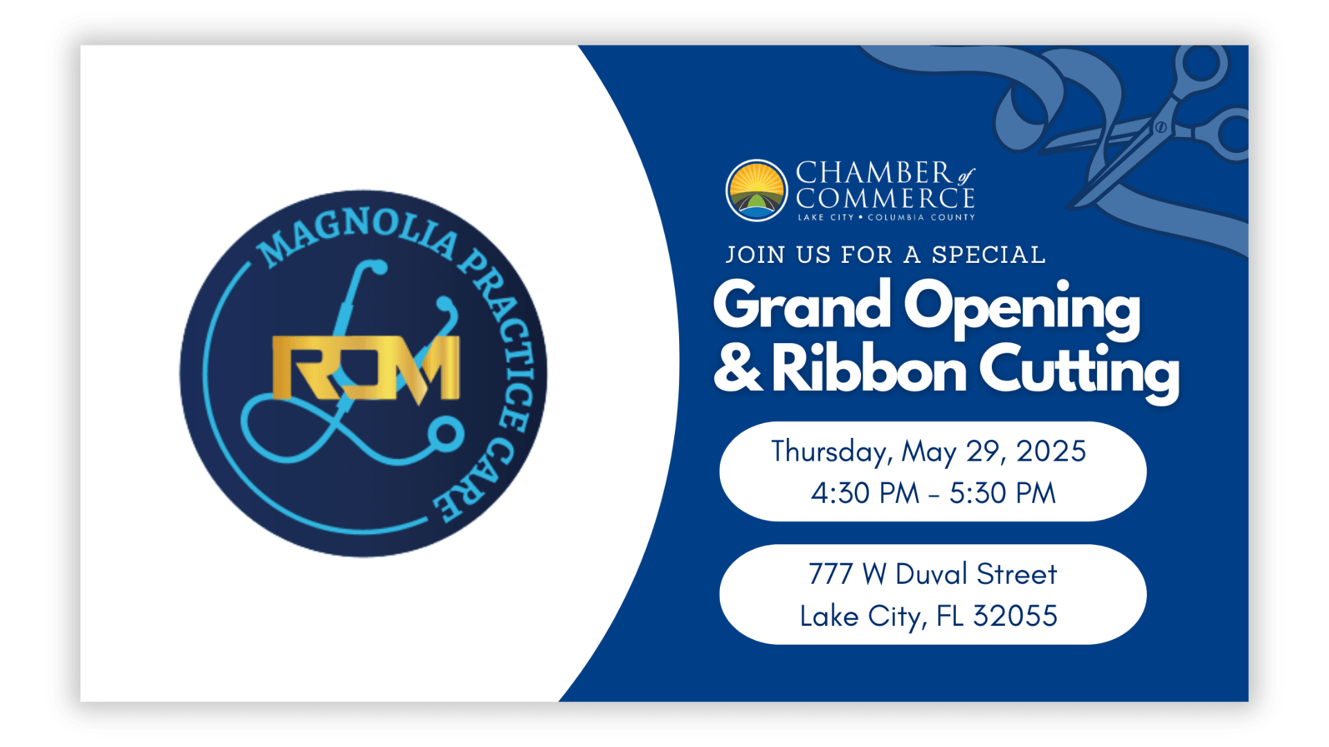 In keeping with the spirit of strengthening our hometown's economy through quality relationships, we invite you to join the Chamber of Commerce, Board of Directors, and your fellow members as we celebrate the Grand Opening of RDM Magnolia Practice Care with a Ceremonial Ribbon Cutting on May 29, 2025, at 4:30 pm. We look forward to seeing you soon!