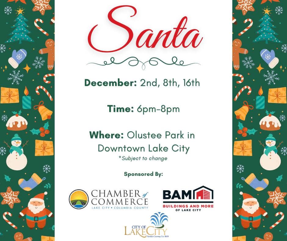 The Lake City - Columbia County Chamber of Commerce is once again thrilled to host Santa Claus in Olustee Park in Downtown Lake City, select nights throughout the month of December.