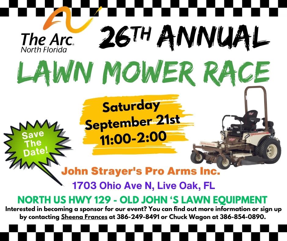 The Arc North Florida and the Elks Lodge of Live Oak are hosting the 26th Annual Lawn Mower Race on September 21st from 11am until the races are finished.