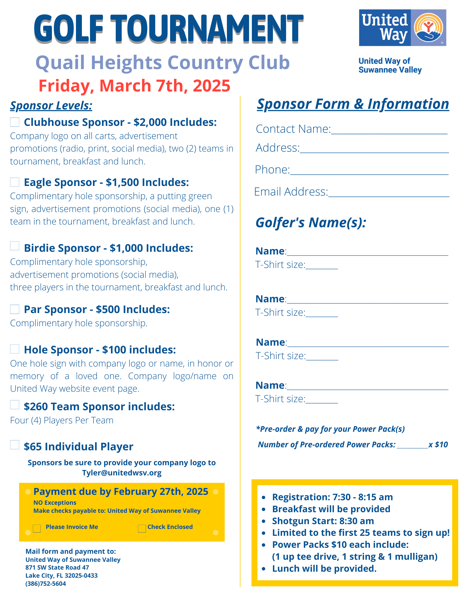 Join us for United Way of Suwannee Valley's 2025 Golf Tournament