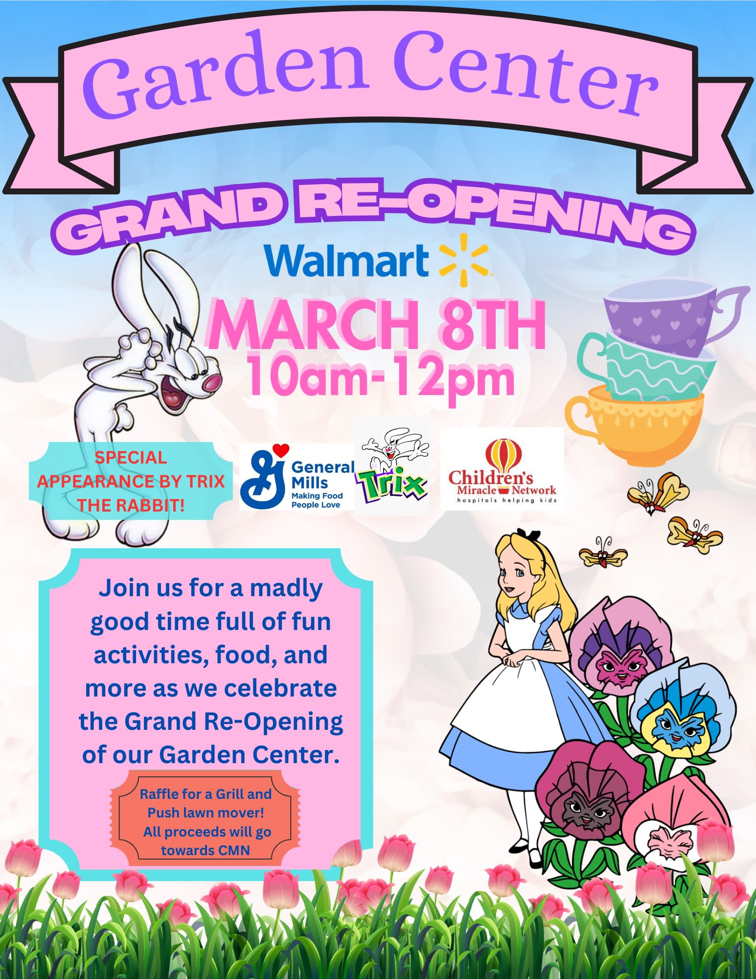 Come take a walk through the flowers while enjoying games, cupcakes, raffles for a brand new push mower, and grill! Special appearance by TRIX the rabbit!