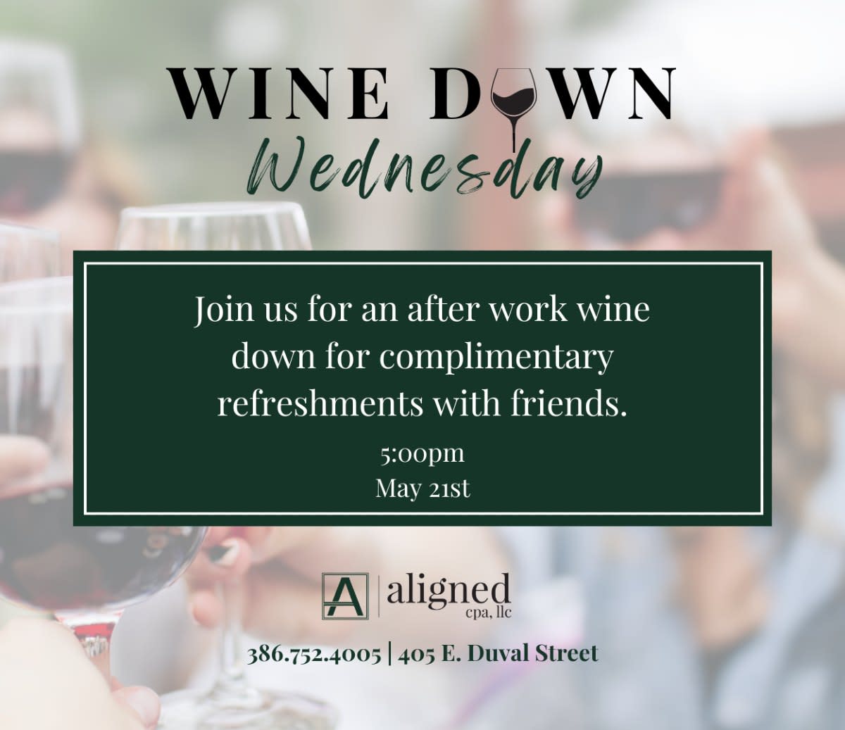 Our quarterly "Wine Down Wednesday" is back! Join us at Aligned CPA on May 21st for a relaxed evening of networking, wine, and light snacks. Let’s raise a glass to building connections!