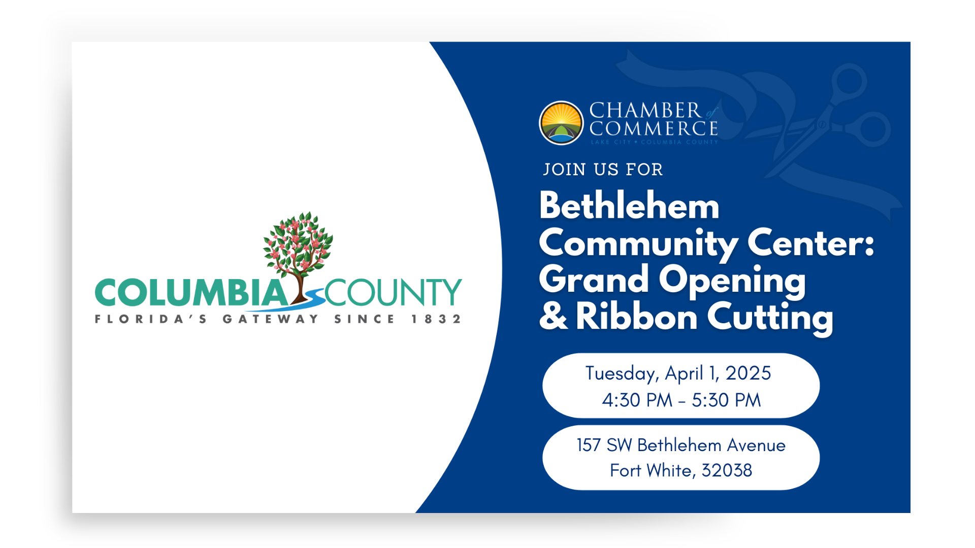 The Lake City - Columbia County Chamber of Commerce is proud to celebrate the Bethlehem Community Center in Fort White and the completion of their newly constructed facility. We invite you to join the Chamber of Commerce, Board of Directors, and fellow members to explore their beautiful space and learn more about the impact they continue to make in our community.