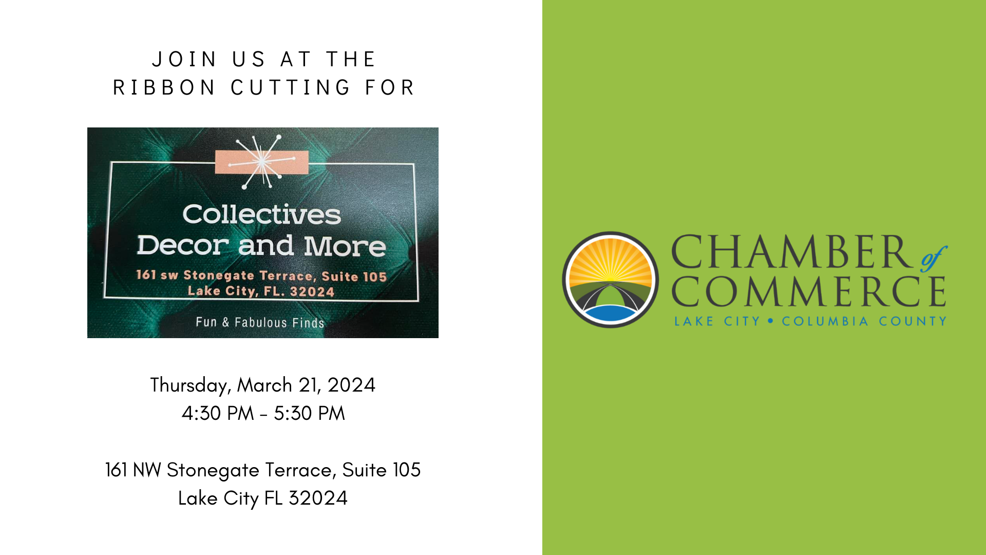 The Lake City - Columbia County Chamber of Commerce is proud to announce that Collectives Decor and More is celebrating its grand opening with a ceremonial ribbon cutting. They invite you to celebrate, along with the Board of Directors and your fellow members. We hope to see you there!