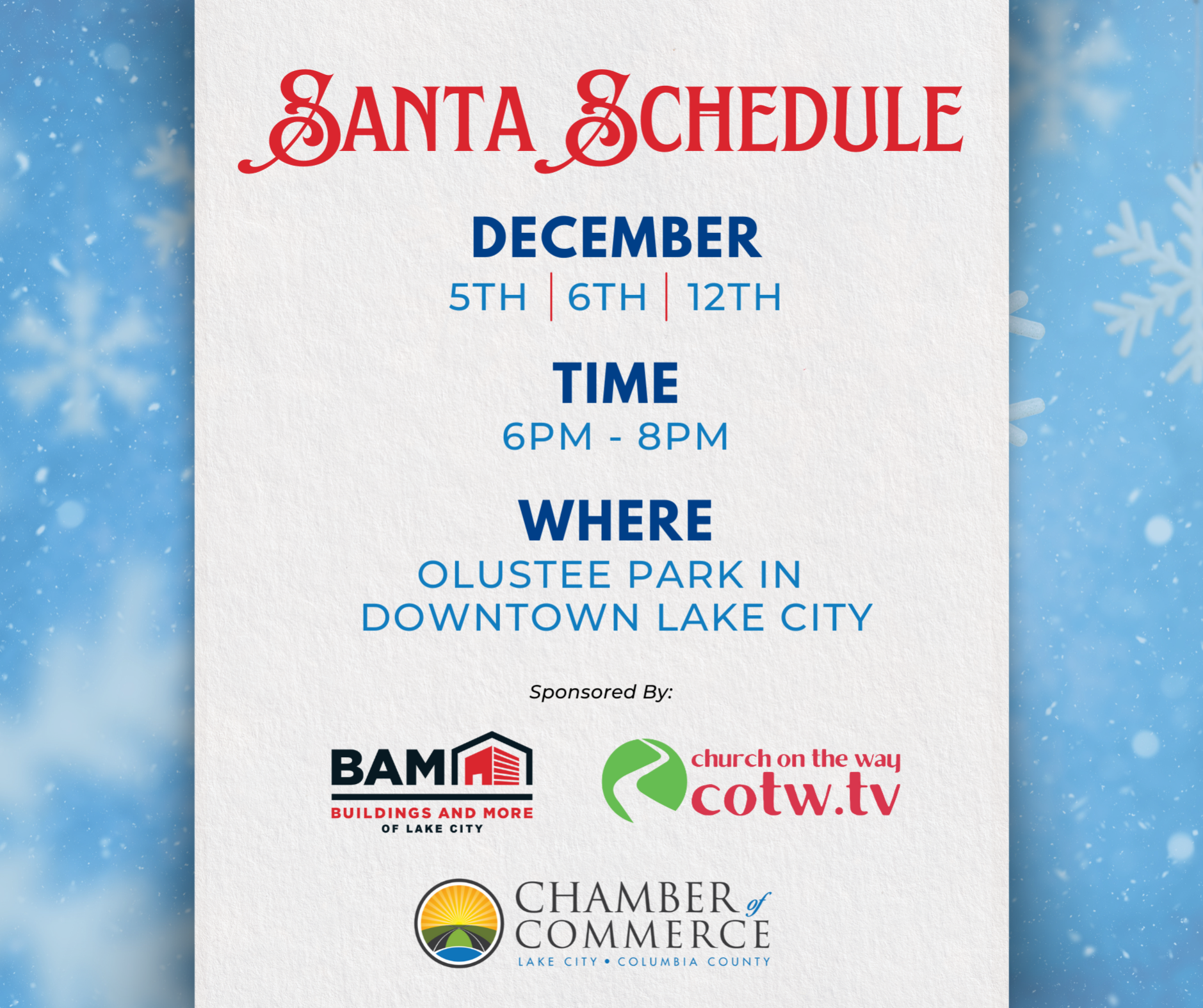 The Lake City - Columbia County Chamber of Commerce is once again thrilled to host Santa Claus in Olustee Park in Downtown Lake City, select nights throughout the month of December.
