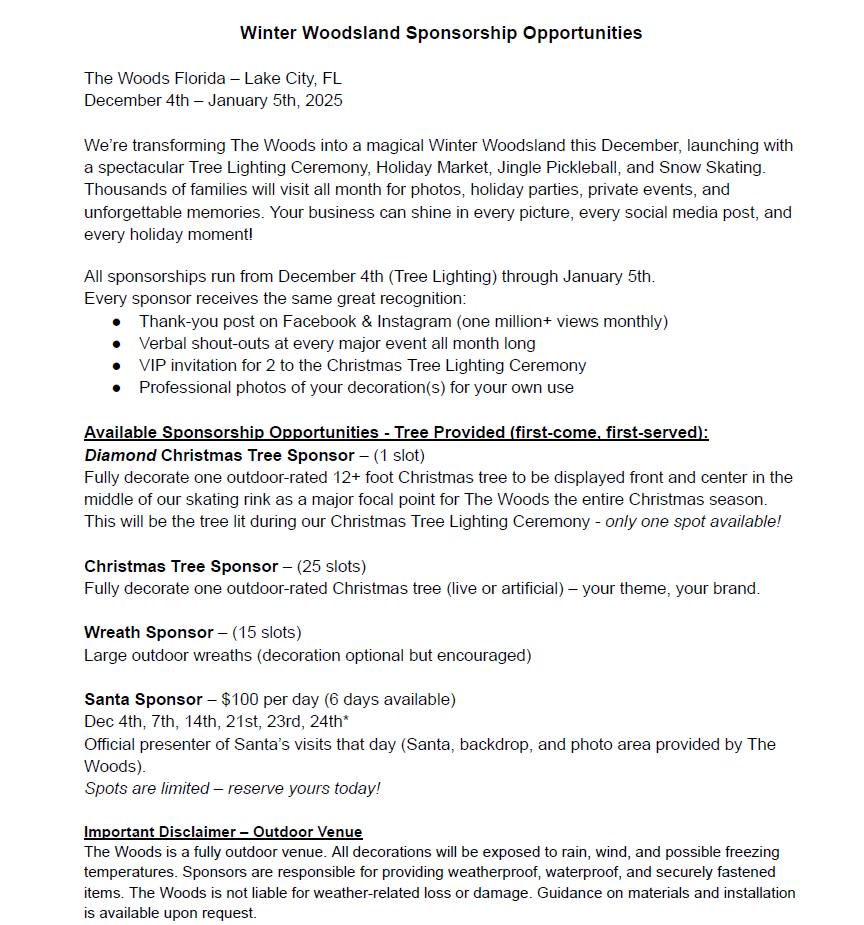 The Woods invites you to be a part of Winter Woodsland by decorating a tree on behalf of your business. You will provide signage for your tree and receive advertising from Dec. 4th - January 6th! Please review our Sponsorship form and contact MARKETPLACE@THEWOODSFLORIDA.COM with questions.