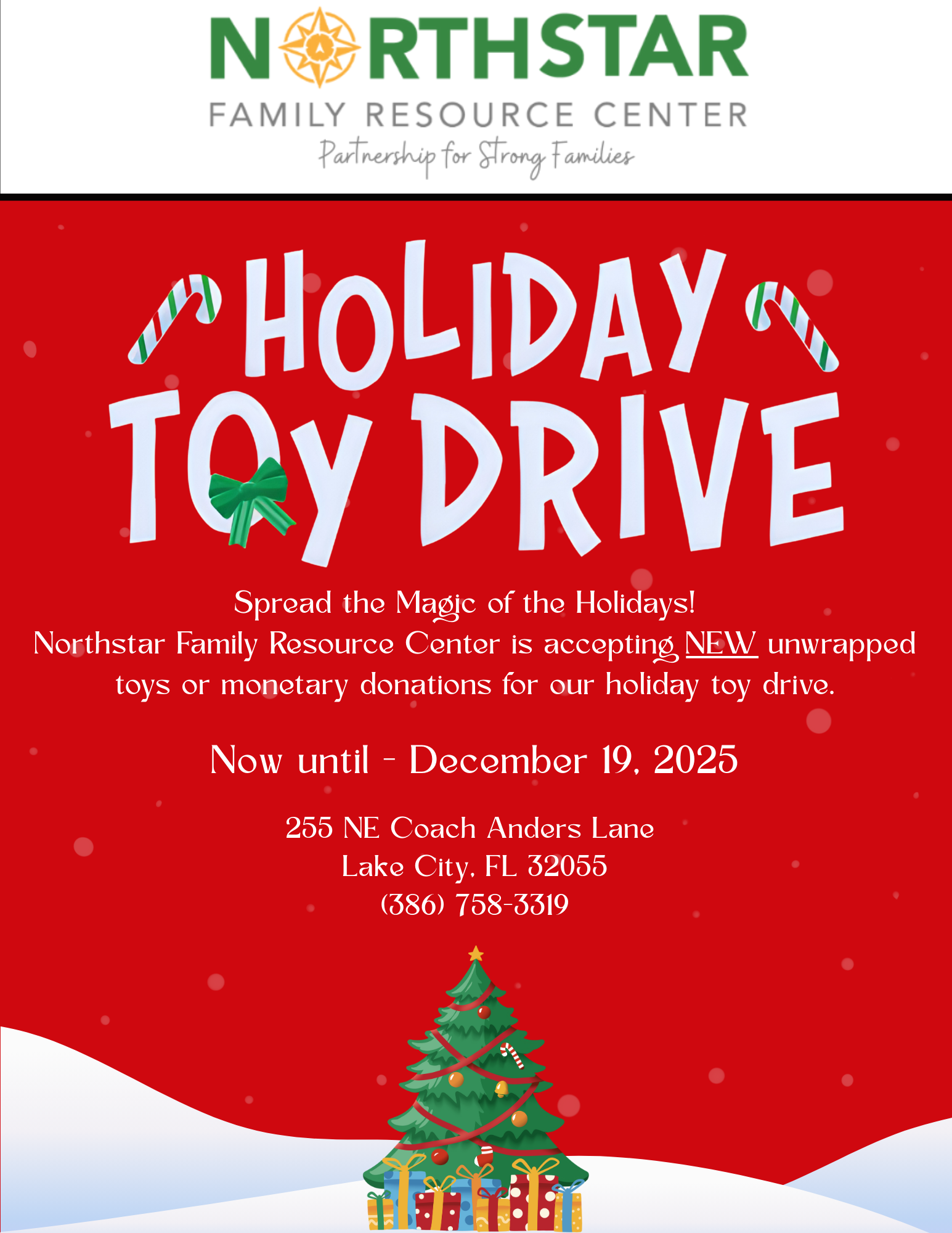NorthStar Family Resource Center (NSFRC) is excited to announce the 2025 Toy Giveaway! This event will take place on Monday, December 22, 2025, at our office located at 255 NE Coach Anders Lane, Lake City, Florida 32055. The event will be from 10:00 AM to 12:30 PM. Our goal is to ensure that every child receives toys for the holiday season.
